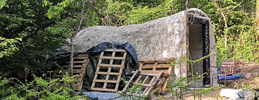 La kerterre "Esprit Cabane", initiée l'an passé, est fermée, nous avons maintenant posé la costière du skydôme. L'enduit intérieur a été fait (et bien fait !) par une équipe de choc. L'isolant extérieur est aussi terminé. Nous sommes sur le point de finir la couche d'harmonisateur. Ensuite viendront les deux dernières couches d'enduits finaux.